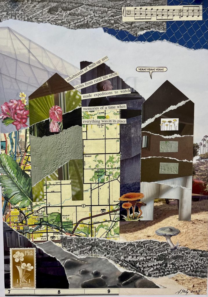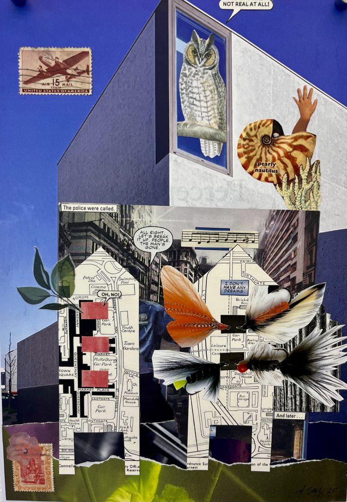 When I moved to a very rural area of Wales, I felt a loss of inspiration until I visited Berlin in 2004 where the style of architecture caused me to work with a new energy. Since then I have combined the views of „the rural idyll“ of Wales with comic asides and graphic exclamations to create work. Coming back to Berlin I hope to have a new inspiration to create new work of collages. Buildings all have their own personalities and I imagine them having intense conversations and arguments over the cityscape and architectural styles!“