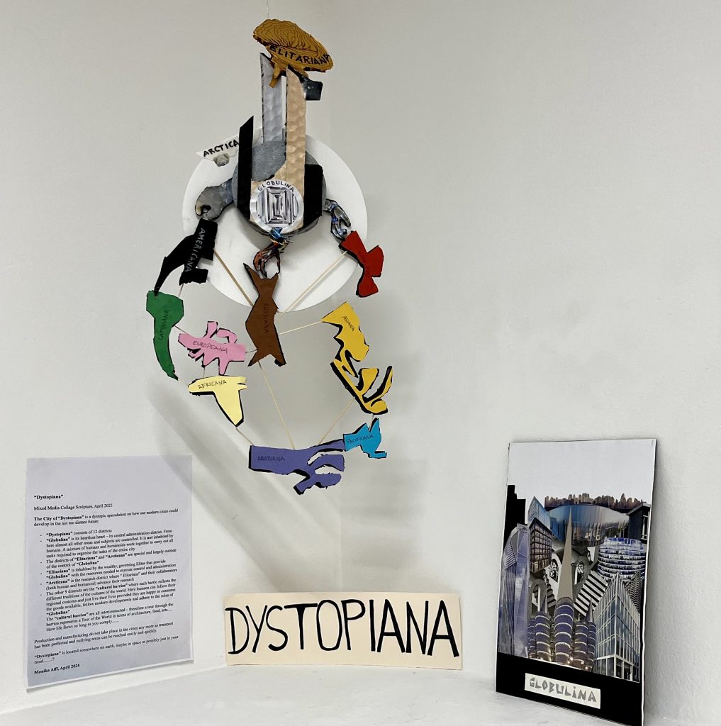 In preparation for the residency, I came up with the idea of the ‚City of Dystopiana‘, an imaginary city that is controlled by its centre, void of humans, whilst in its districts life appears to continue as usual. This resulted in the little installation Dystopiana.“